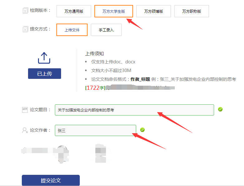 第三步:提交需要上傳的論文。在萬方查重界面點擊“上傳論文”,選擇好需要查重的文章,上傳到系統即可。注意:需要填寫好論文作者、論文的標題,特別是借鑒過已經發表的文章,寫了才能保證結果準確。