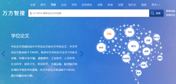 萬方博碩士論文庫(中國學位論文全文數據庫),是萬方數據股份有限公司受中國科技信息研究所(簡稱中信)委托加工的“中國學位論文文摘數據庫”,該數據庫收錄我國各學科領域的學位論文。數據庫內容:涵蓋理學、工業技術、人文科學、航空航天等學科的學位論文。還包括萬方學術期刊、會議、專利。學位論文資源包括中文學位論文和外文學位論文。